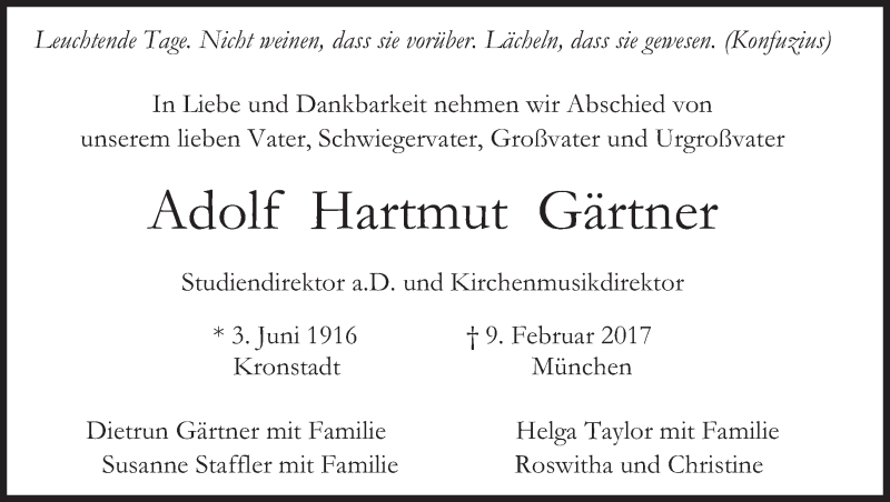 Hier finden Sie alle Traueranzeigen aus der Zeitung, die bisher für Adolf Hartmut Gärtner erschienen sind. Weitere Traueranzeigen, die in der Zeitung erscheinen, werden hier ebenfalls aufgelistet