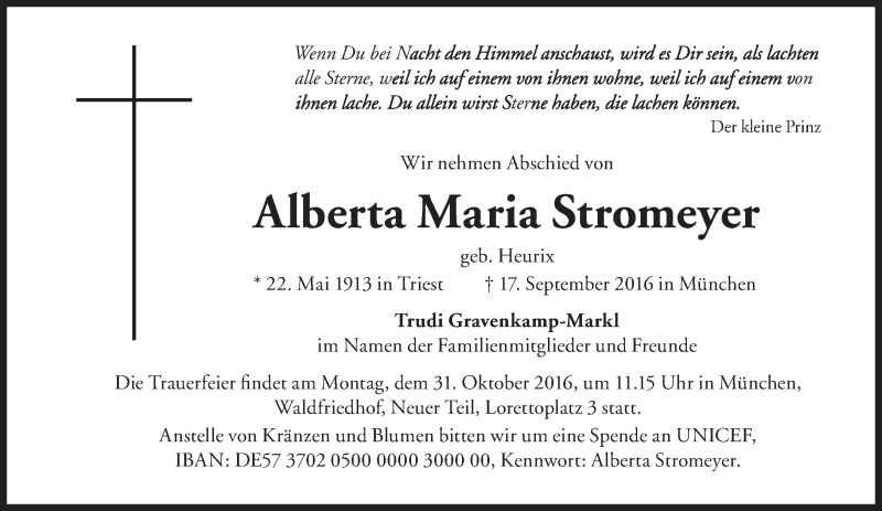 Hier finden Sie alle Traueranzeigen aus der Zeitung, die bisher für Alberta Maria Stromeyer erschienen sind. Weitere Traueranzeigen, die in der Zeitung erscheinen, werden hier ebenfalls aufgelistet