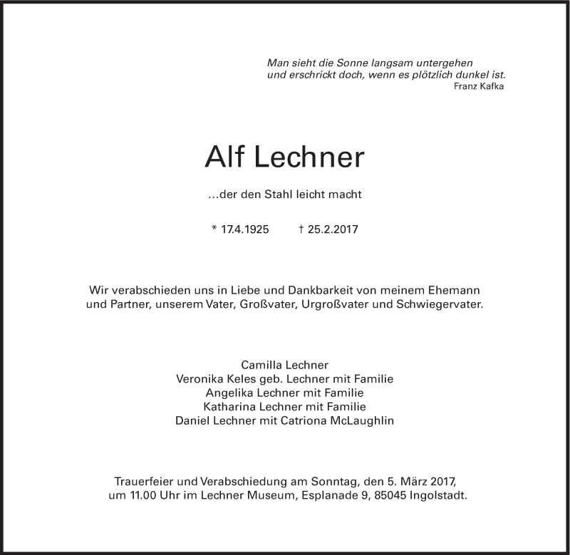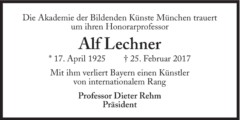Hier finden Sie alle Traueranzeigen aus der Zeitung, die bisher für Alf Lechner erschienen sind. Weitere Traueranzeigen, die in der Zeitung erscheinen, werden hier ebenfalls aufgelistet