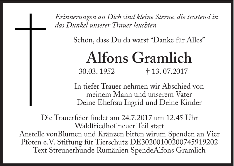 Hier finden Sie alle Traueranzeigen aus der Zeitung, die bisher für Alfons Gramlich erschienen sind. Weitere Traueranzeigen, die in der Zeitung erscheinen, werden hier ebenfalls aufgelistet