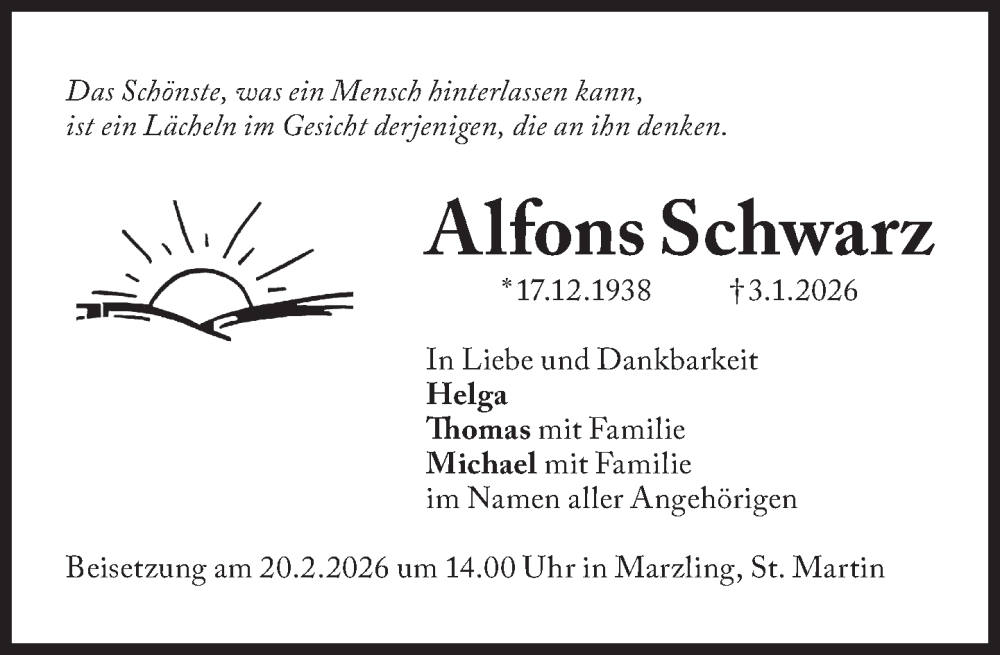 Hier finden Sie alle Traueranzeigen aus der Zeitung, die bisher für Alfons Schwarz erschienen sind. Weitere Traueranzeigen, die in der Zeitung erscheinen, werden hier ebenfalls aufgelistet