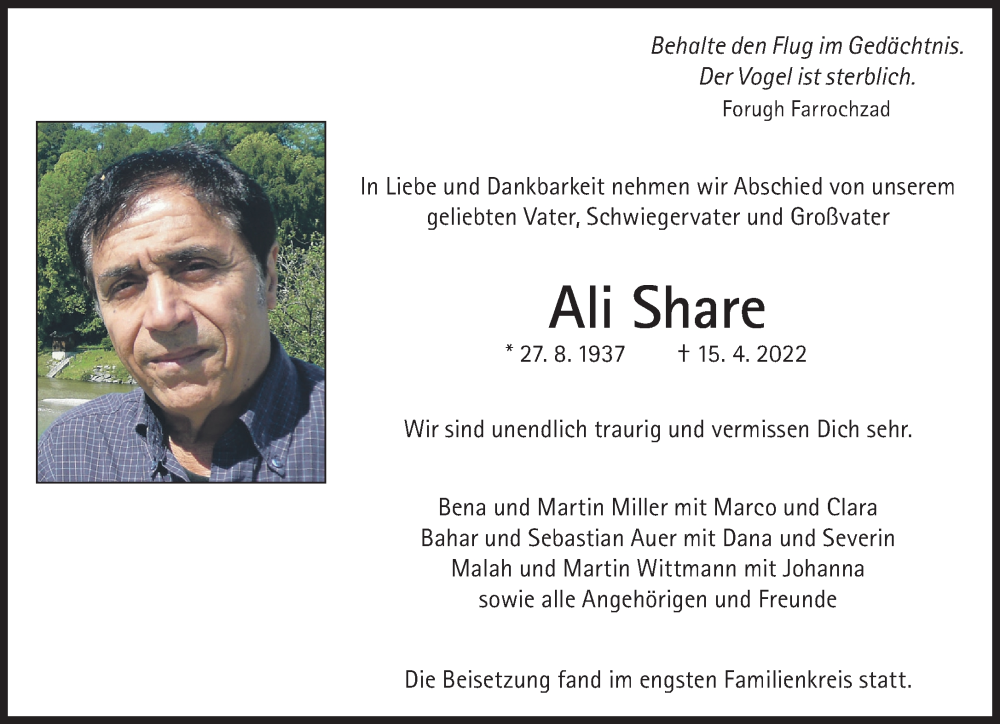 Hier finden Sie alle Traueranzeigen aus der Zeitung, die bisher für Ali Share erschienen sind. Weitere Traueranzeigen, die in der Zeitung erscheinen, werden hier ebenfalls aufgelistet
