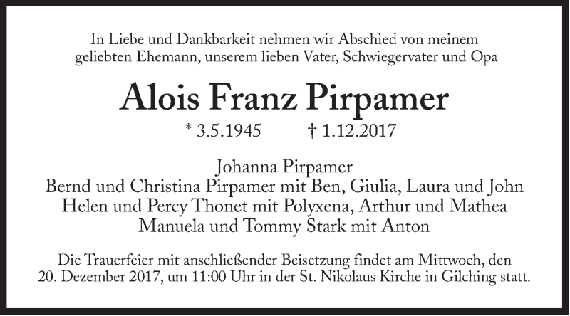 Hier finden Sie alle Traueranzeigen aus der Zeitung, die bisher für Alois Franz Pirpamer erschienen sind. Weitere Traueranzeigen, die in der Zeitung erscheinen, werden hier ebenfalls aufgelistet
