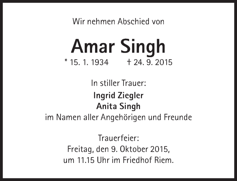Hier finden Sie alle Traueranzeigen aus der Zeitung, die bisher für Amar Singh erschienen sind. Weitere Traueranzeigen, die in der Zeitung erscheinen, werden hier ebenfalls aufgelistet