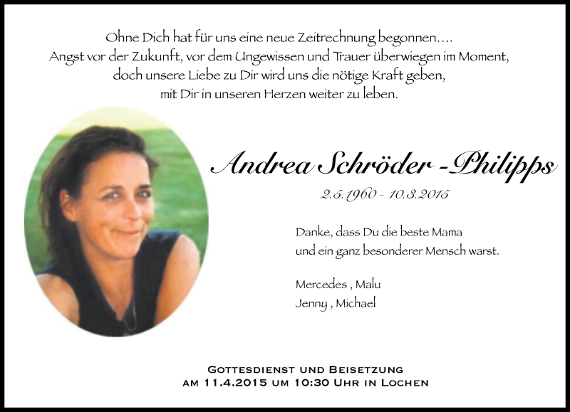 Hier finden Sie alle Traueranzeigen aus der Zeitung, die bisher für Andrea Schröder-Philipps erschienen sind. Weitere Traueranzeigen, die in der Zeitung erscheinen, werden hier ebenfalls aufgelistet