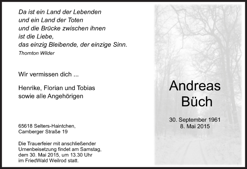 Hier finden Sie alle Traueranzeigen aus der Zeitung, die bisher für Andreas Büch erschienen sind. Weitere Traueranzeigen, die in der Zeitung erscheinen, werden hier ebenfalls aufgelistet
