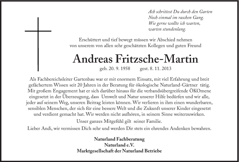 Hier finden Sie alle Traueranzeigen aus der Zeitung, die bisher für Andreas Fritzsche-Martin erschienen sind. Weitere Traueranzeigen, die in der Zeitung erscheinen, werden hier ebenfalls aufgelistet