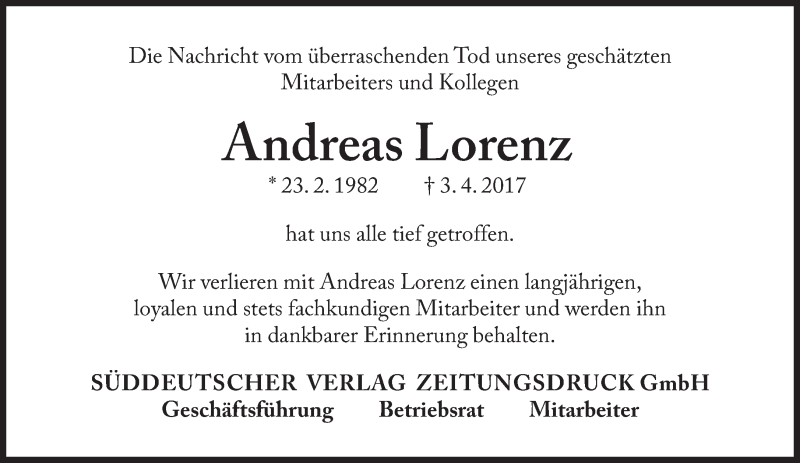 Hier finden Sie alle Traueranzeigen aus der Zeitung, die bisher für Andreas Lorenz erschienen sind. Weitere Traueranzeigen, die in der Zeitung erscheinen, werden hier ebenfalls aufgelistet