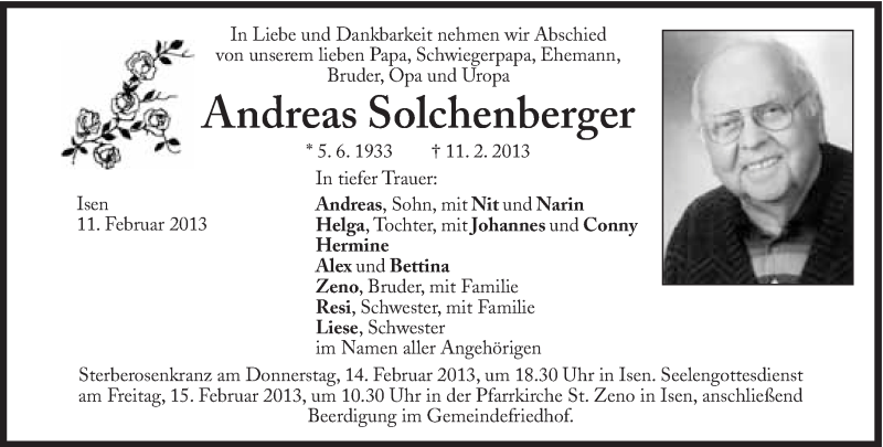 Hier finden Sie alle Traueranzeigen aus der Zeitung, die bisher für Andreas Solchenberger erschienen sind. Weitere Traueranzeigen, die in der Zeitung erscheinen, werden hier ebenfalls aufgelistet