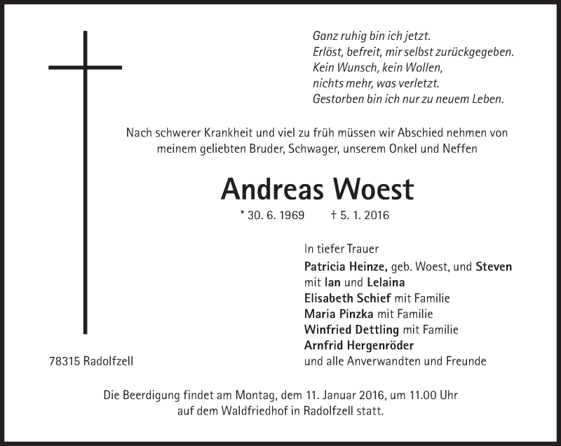 Hier finden Sie alle Traueranzeigen aus der Zeitung, die bisher für Andreas Woest erschienen sind. Weitere Traueranzeigen, die in der Zeitung erscheinen, werden hier ebenfalls aufgelistet