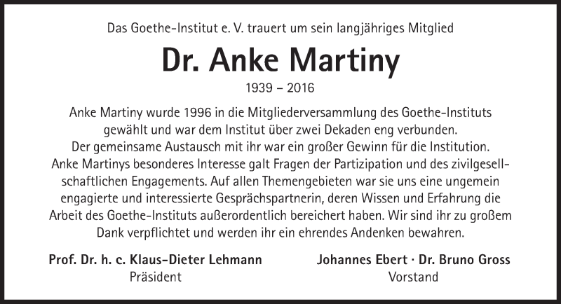 Hier finden Sie alle Traueranzeigen aus der Zeitung, die bisher für Anke Martiny erschienen sind. Weitere Traueranzeigen, die in der Zeitung erscheinen, werden hier ebenfalls aufgelistet