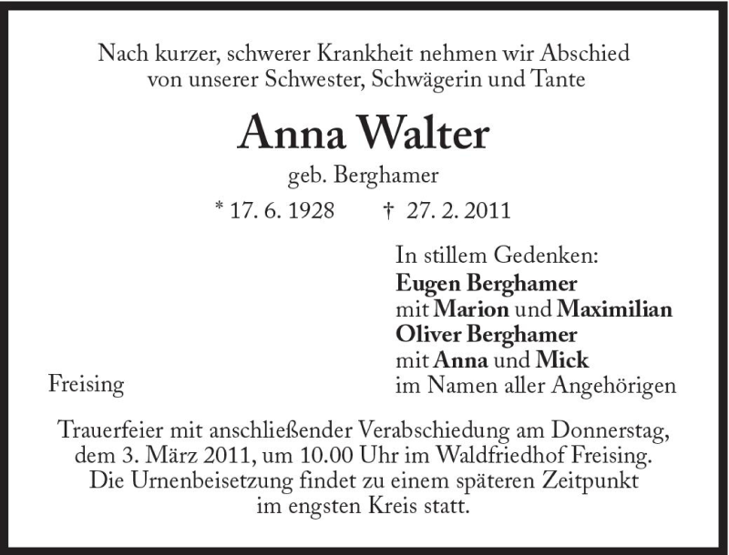 Hier finden Sie alle Traueranzeigen aus der Zeitung, die bisher für Anna Walter erschienen sind. Weitere Traueranzeigen, die in der Zeitung erscheinen, werden hier ebenfalls aufgelistet
