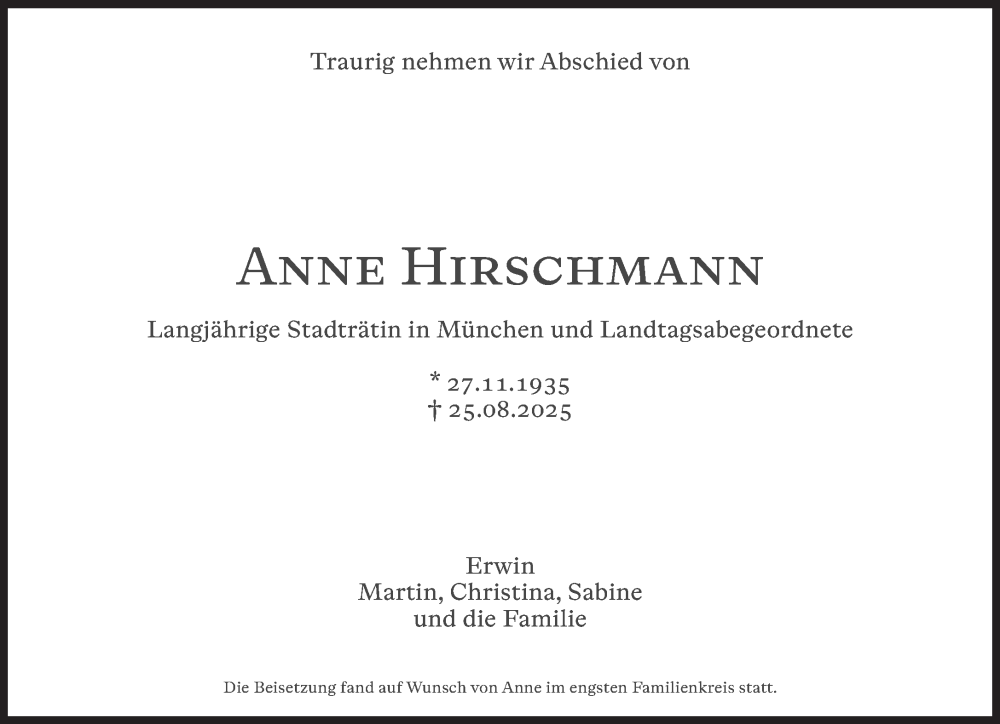 Hier finden Sie alle Traueranzeigen aus der Zeitung, die bisher für Anne Hirschmann erschienen sind. Weitere Traueranzeigen, die in der Zeitung erscheinen, werden hier ebenfalls aufgelistet