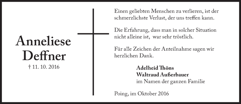 Hier finden Sie alle Traueranzeigen aus der Zeitung, die bisher für Anneliese Deffner erschienen sind. Weitere Traueranzeigen, die in der Zeitung erscheinen, werden hier ebenfalls aufgelistet