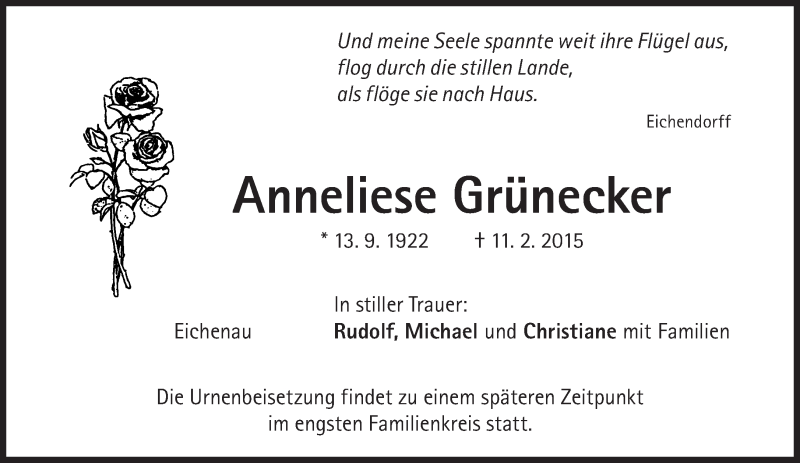 Hier finden Sie alle Traueranzeigen aus der Zeitung, die bisher für Anneliese Grünecker erschienen sind. Weitere Traueranzeigen, die in der Zeitung erscheinen, werden hier ebenfalls aufgelistet