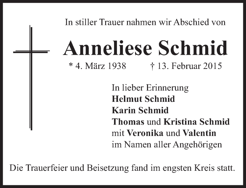 Hier finden Sie alle Traueranzeigen aus der Zeitung, die bisher für Anneliese Schmid erschienen sind. Weitere Traueranzeigen, die in der Zeitung erscheinen, werden hier ebenfalls aufgelistet