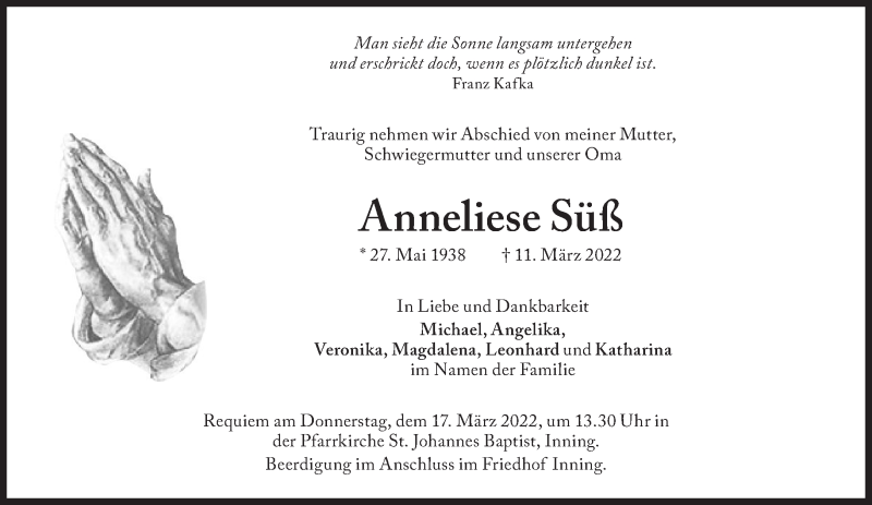 Hier finden Sie alle Traueranzeigen aus der Zeitung, die bisher für Anneliese Süß erschienen sind. Weitere Traueranzeigen, die in der Zeitung erscheinen, werden hier ebenfalls aufgelistet