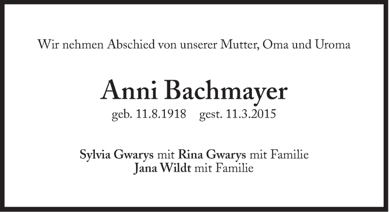 Hier finden Sie alle Traueranzeigen aus der Zeitung, die bisher für Anni Bachmayer erschienen sind. Weitere Traueranzeigen, die in der Zeitung erscheinen, werden hier ebenfalls aufgelistet
