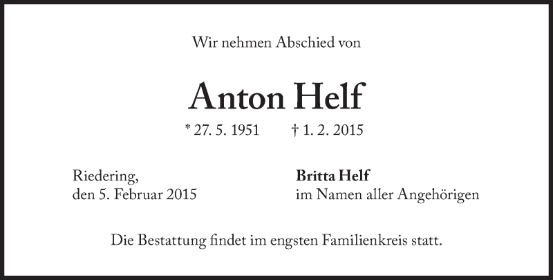 Hier finden Sie alle Traueranzeigen aus der Zeitung, die bisher für Anton Helf erschienen sind. Weitere Traueranzeigen, die in der Zeitung erscheinen, werden hier ebenfalls aufgelistet