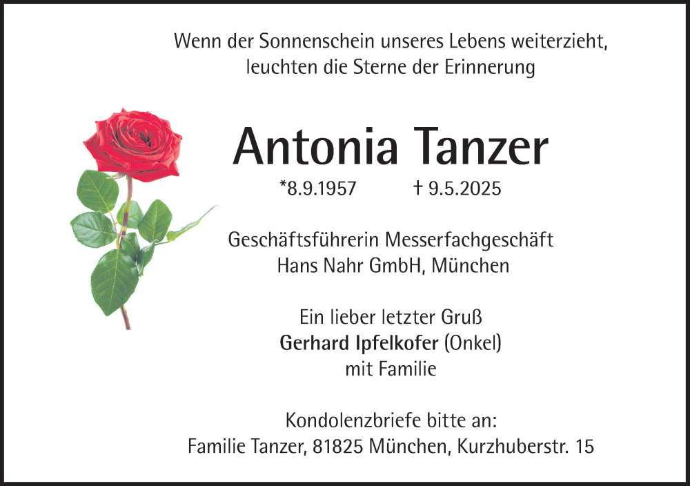Hier finden Sie alle Traueranzeigen aus der Zeitung, die bisher für Antonia Tanzer erschienen sind. Weitere Traueranzeigen, die in der Zeitung erscheinen, werden hier ebenfalls aufgelistet