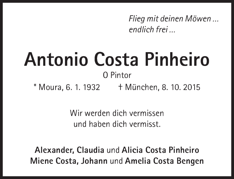 Hier finden Sie alle Traueranzeigen aus der Zeitung, die bisher für Antonio Costa Pinheiro erschienen sind. Weitere Traueranzeigen, die in der Zeitung erscheinen, werden hier ebenfalls aufgelistet