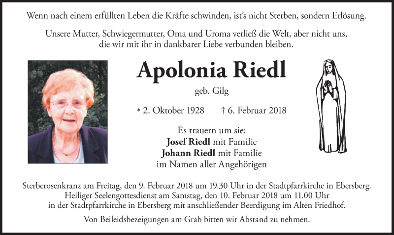 Hier finden Sie alle Traueranzeigen aus der Zeitung, die bisher für Apolonia Riedl erschienen sind. Weitere Traueranzeigen, die in der Zeitung erscheinen, werden hier ebenfalls aufgelistet