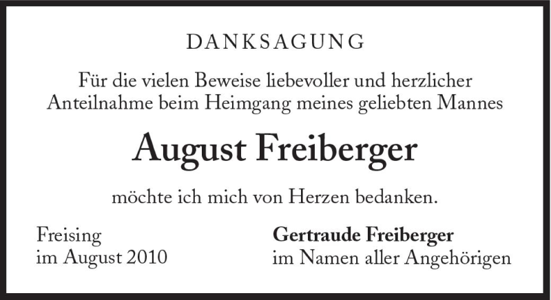 Hier finden Sie alle Traueranzeigen aus der Zeitung, die bisher für August Freiberger erschienen sind. Weitere Traueranzeigen, die in der Zeitung erscheinen, werden hier ebenfalls aufgelistet