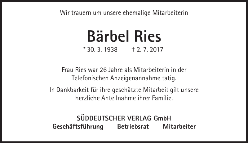 Hier finden Sie alle Traueranzeigen aus der Zeitung, die bisher für Bärbel Ries erschienen sind. Weitere Traueranzeigen, die in der Zeitung erscheinen, werden hier ebenfalls aufgelistet