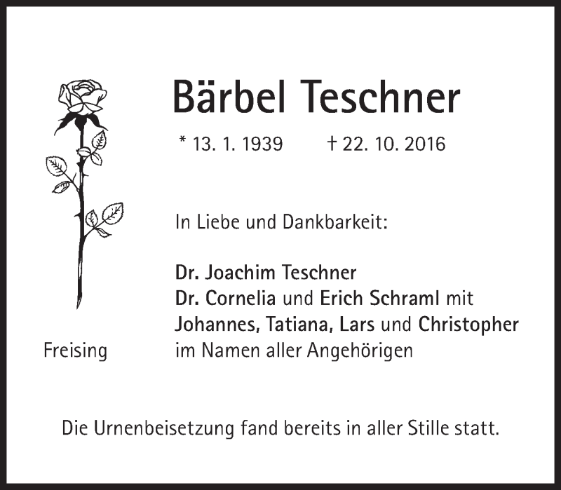 Hier finden Sie alle Traueranzeigen aus der Zeitung, die bisher für Bärbel Teschner erschienen sind. Weitere Traueranzeigen, die in der Zeitung erscheinen, werden hier ebenfalls aufgelistet