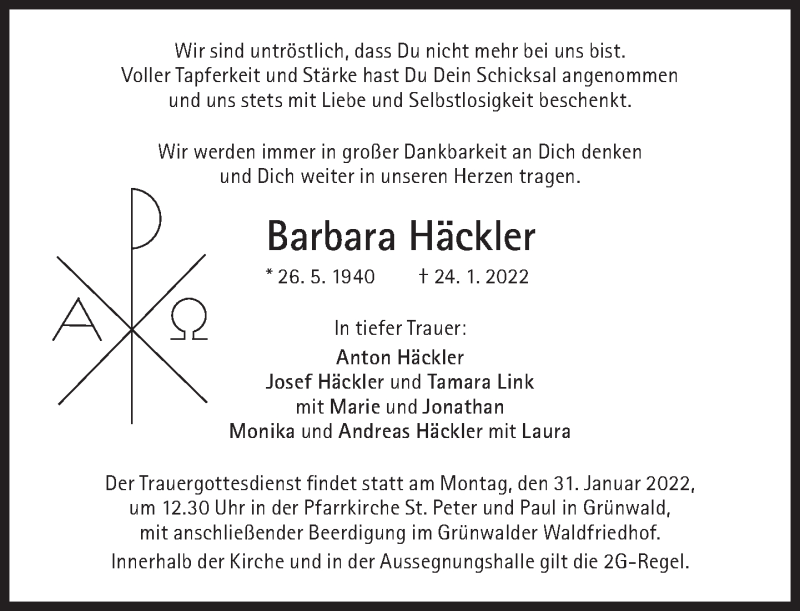 Hier finden Sie alle Traueranzeigen aus der Zeitung, die bisher für Barbara Häckler erschienen sind. Weitere Traueranzeigen, die in der Zeitung erscheinen, werden hier ebenfalls aufgelistet