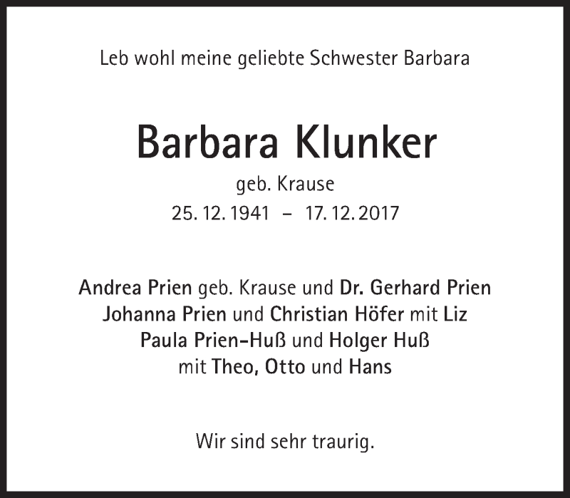 Hier finden Sie alle Traueranzeigen aus der Zeitung, die bisher für Barbara Klunker erschienen sind. Weitere Traueranzeigen, die in der Zeitung erscheinen, werden hier ebenfalls aufgelistet