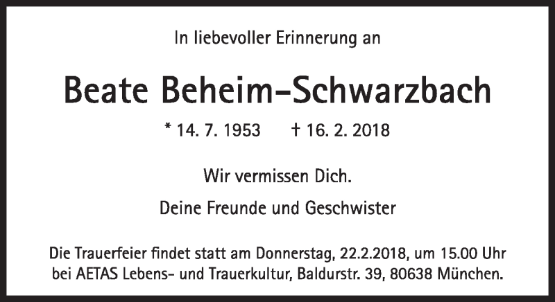 Hier finden Sie alle Traueranzeigen aus der Zeitung, die bisher für Beate Beheim-Schwarzbach, erschienen sind. Weitere Traueranzeigen, die in der Zeitung erscheinen, werden hier ebenfalls aufgelistet