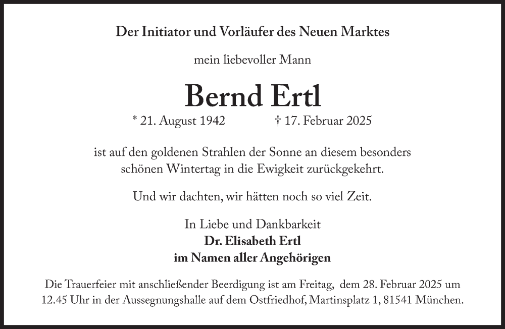 Hier finden Sie alle Traueranzeigen aus der Zeitung, die bisher für Bernd Ertl erschienen sind. Weitere Traueranzeigen, die in der Zeitung erscheinen, werden hier ebenfalls aufgelistet