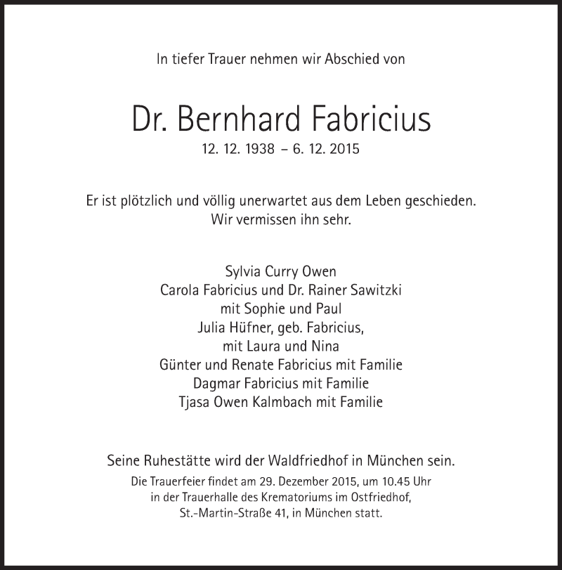 Hier finden Sie alle Traueranzeigen aus der Zeitung, die bisher für Bernhard Fabricius erschienen sind. Weitere Traueranzeigen, die in der Zeitung erscheinen, werden hier ebenfalls aufgelistet