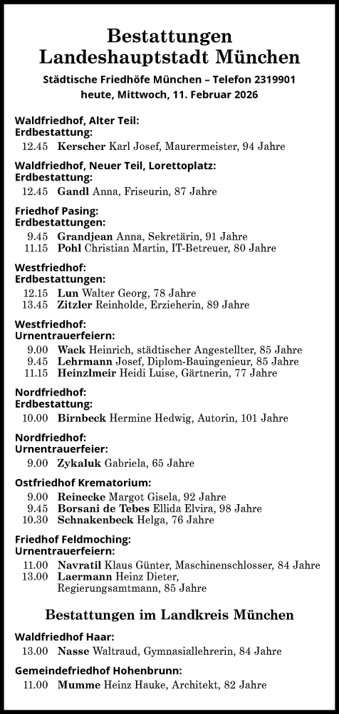 Hier finden Sie alle Traueranzeigen aus der Zeitung, die bisher für Bestattungen vom 11.02.2026 erschienen sind. Weitere Traueranzeigen, die in der Zeitung erscheinen, werden hier ebenfalls aufgelistet