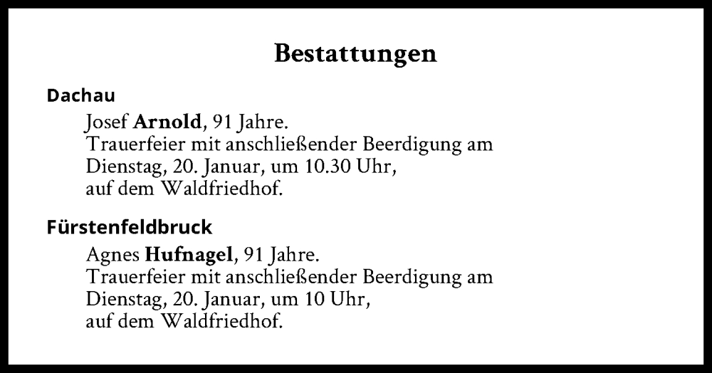 Hier finden Sie alle Traueranzeigen aus der Zeitung, die bisher für Bestattungen vom 20.01.2026 erschienen sind. Weitere Traueranzeigen, die in der Zeitung erscheinen, werden hier ebenfalls aufgelistet