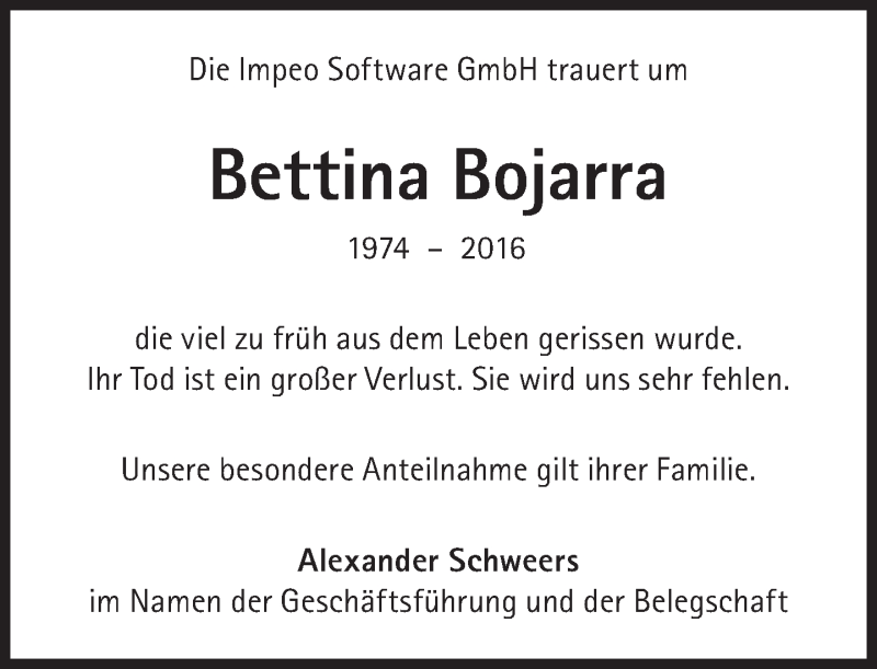 Hier finden Sie alle Traueranzeigen aus der Zeitung, die bisher für Bettina Bojarra erschienen sind. Weitere Traueranzeigen, die in der Zeitung erscheinen, werden hier ebenfalls aufgelistet