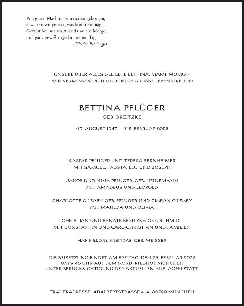Hier finden Sie alle Traueranzeigen aus der Zeitung, die bisher für Bettina Pflüger erschienen sind. Weitere Traueranzeigen, die in der Zeitung erscheinen, werden hier ebenfalls aufgelistet