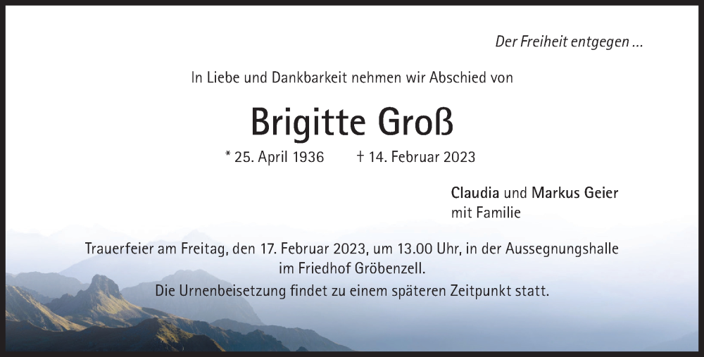 Hier finden Sie alle Traueranzeigen aus der Zeitung, die bisher für Brigitte Groß erschienen sind. Weitere Traueranzeigen, die in der Zeitung erscheinen, werden hier ebenfalls aufgelistet
