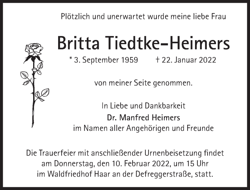 Hier finden Sie alle Traueranzeigen aus der Zeitung, die bisher für Britta Tiedtke-Heimers erschienen sind. Weitere Traueranzeigen, die in der Zeitung erscheinen, werden hier ebenfalls aufgelistet