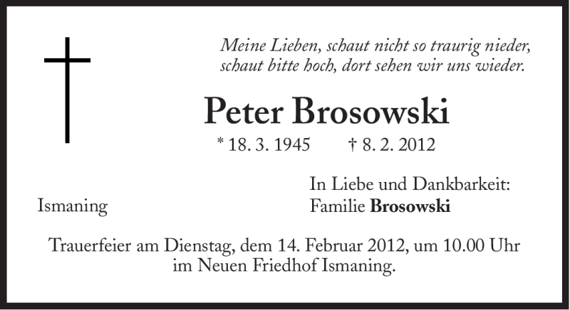 Hier finden Sie alle Traueranzeigen aus der Zeitung, die bisher für Brosowski Peter erschienen sind. Weitere Traueranzeigen, die in der Zeitung erscheinen, werden hier ebenfalls aufgelistet