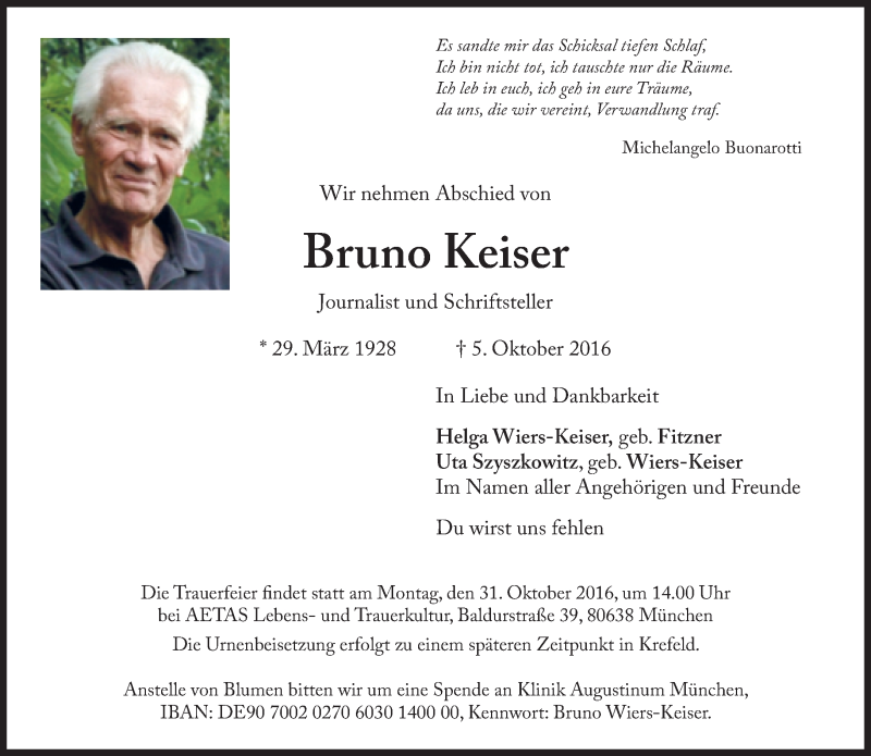 Hier finden Sie alle Traueranzeigen aus der Zeitung, die bisher für Bruno Keiser erschienen sind. Weitere Traueranzeigen, die in der Zeitung erscheinen, werden hier ebenfalls aufgelistet