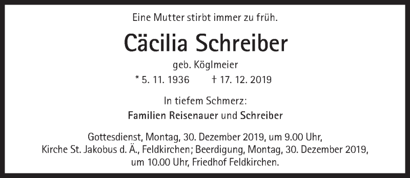 Hier finden Sie alle Traueranzeigen aus der Zeitung, die bisher für Cäcilia Schreiber erschienen sind. Weitere Traueranzeigen, die in der Zeitung erscheinen, werden hier ebenfalls aufgelistet