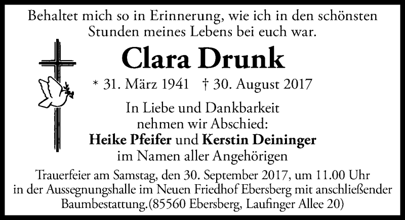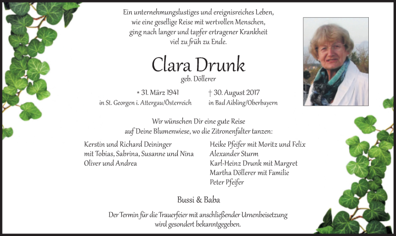 Hier finden Sie alle Traueranzeigen aus der Zeitung, die bisher für Clara Drunk erschienen sind. Weitere Traueranzeigen, die in der Zeitung erscheinen, werden hier ebenfalls aufgelistet