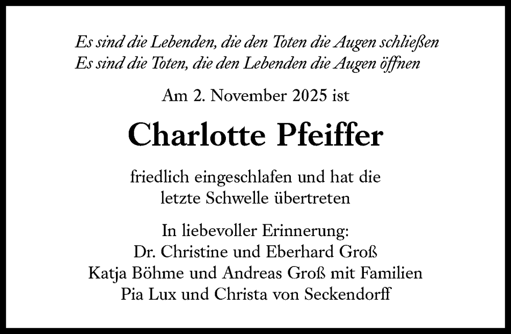 Hier finden Sie alle Traueranzeigen aus der Zeitung, die bisher für Charlotte Pfeiffer erschienen sind. Weitere Traueranzeigen, die in der Zeitung erscheinen, werden hier ebenfalls aufgelistet
