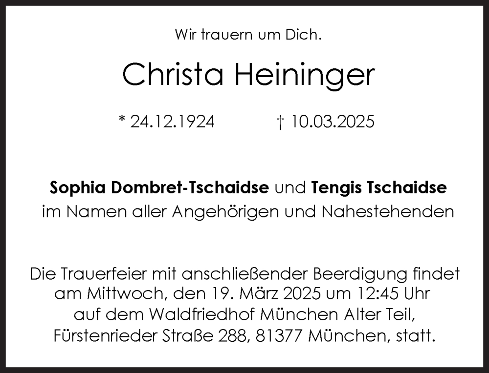 Hier finden Sie alle Traueranzeigen aus der Zeitung, die bisher für Christa Heininger erschienen sind. Weitere Traueranzeigen, die in der Zeitung erscheinen, werden hier ebenfalls aufgelistet