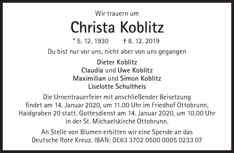 Hier finden Sie alle Traueranzeigen aus der Zeitung, die bisher für Christa Koblitz erschienen sind. Weitere Traueranzeigen, die in der Zeitung erscheinen, werden hier ebenfalls aufgelistet