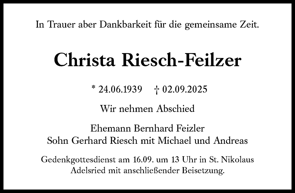 Hier finden Sie alle Traueranzeigen aus der Zeitung, die bisher für Christa Riesch-Feilzer erschienen sind. Weitere Traueranzeigen, die in der Zeitung erscheinen, werden hier ebenfalls aufgelistet