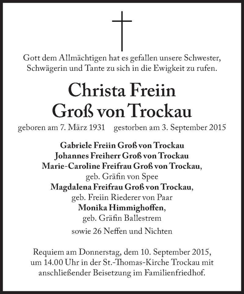 Hier finden Sie alle Traueranzeigen aus der Zeitung, die bisher für Christa Freiin Groß von Trockau erschienen sind. Weitere Traueranzeigen, die in der Zeitung erscheinen, werden hier ebenfalls aufgelistet