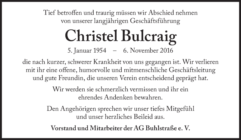 Hier finden Sie alle Traueranzeigen aus der Zeitung, die bisher für Christel Bulcraig erschienen sind. Weitere Traueranzeigen, die in der Zeitung erscheinen, werden hier ebenfalls aufgelistet